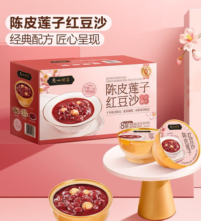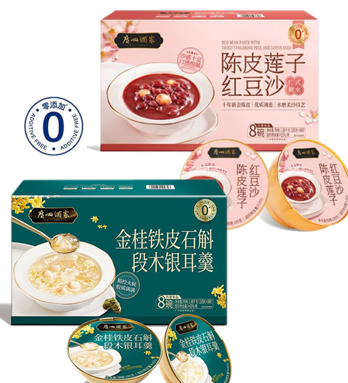 | 组 成 | 陈皮莲子红豆沙185g*8罐/箱+金桂铁皮石斛银耳羹185g*8罐/箱 |